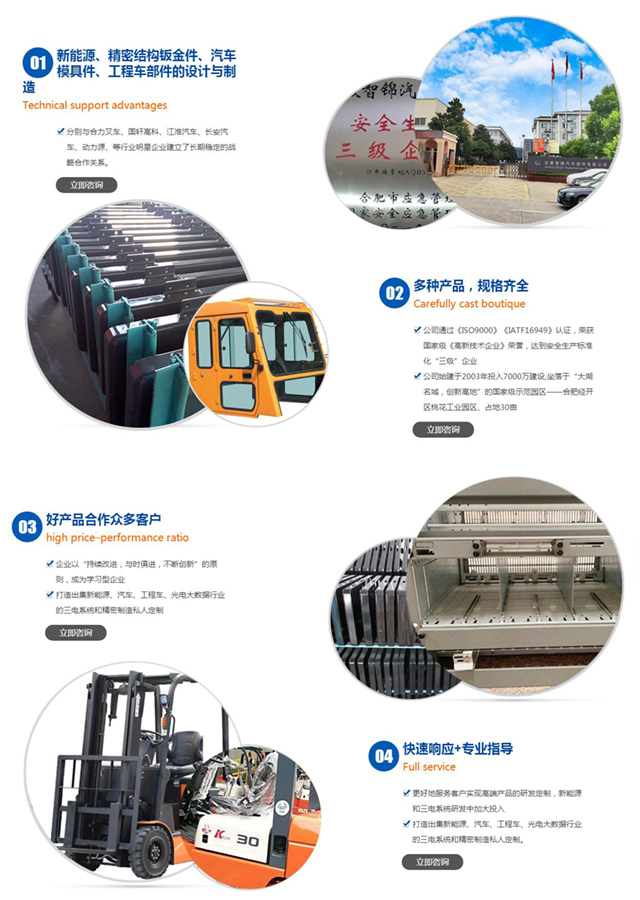 安徽智锦汽车部件有限公司于2003年5月份,成立于“大湖名城,创新高地”的*********示范园区——合肥经开区桃花工业园区。公司总投资7000万,占地30亩,建筑面积 21800平方,生产面积约14000平米,其中办公、科研、宿舍约7800平方。主要客户:合力叉车、国轩高科、江淮汽车、长安汽车、上海龙工、动力源等知名企业,建立了长期稳定的合作关系。2022年起公司升级转型,主要从事新能源工程机械精密结构、...